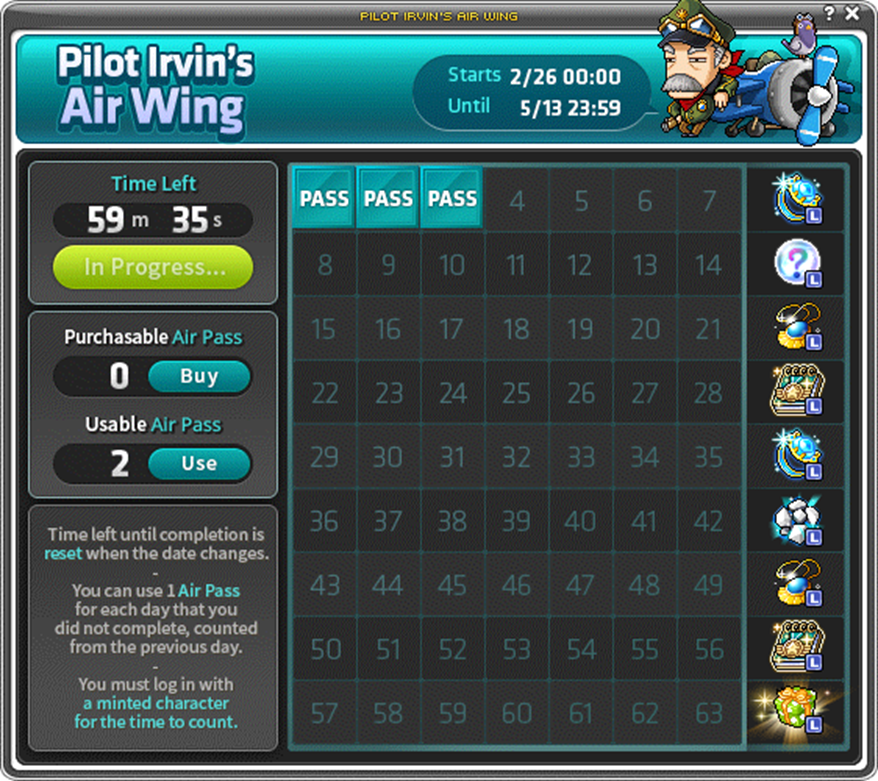 3. If you miss a day, you can use an Air Pass to complete a previous check-in. Each Air Pass costs 200,000 NESO.
